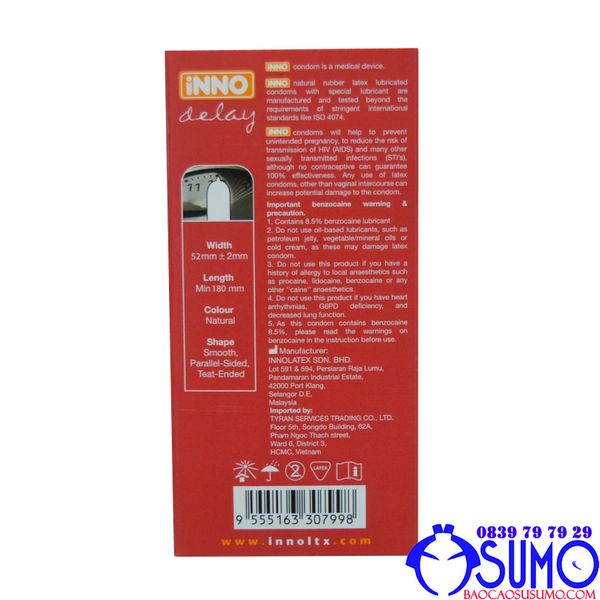 Bao cao su Inno delay keo dài thời gian là sản phẩm giúp nam giới duy trì phong độ "yêu" tốt hơn, với Ben-zo-caine 8,5% giúp kéo dài thời gian quan hệ, chống xuất tinh sớm cho nam giới, đứng top cao hiện nay.